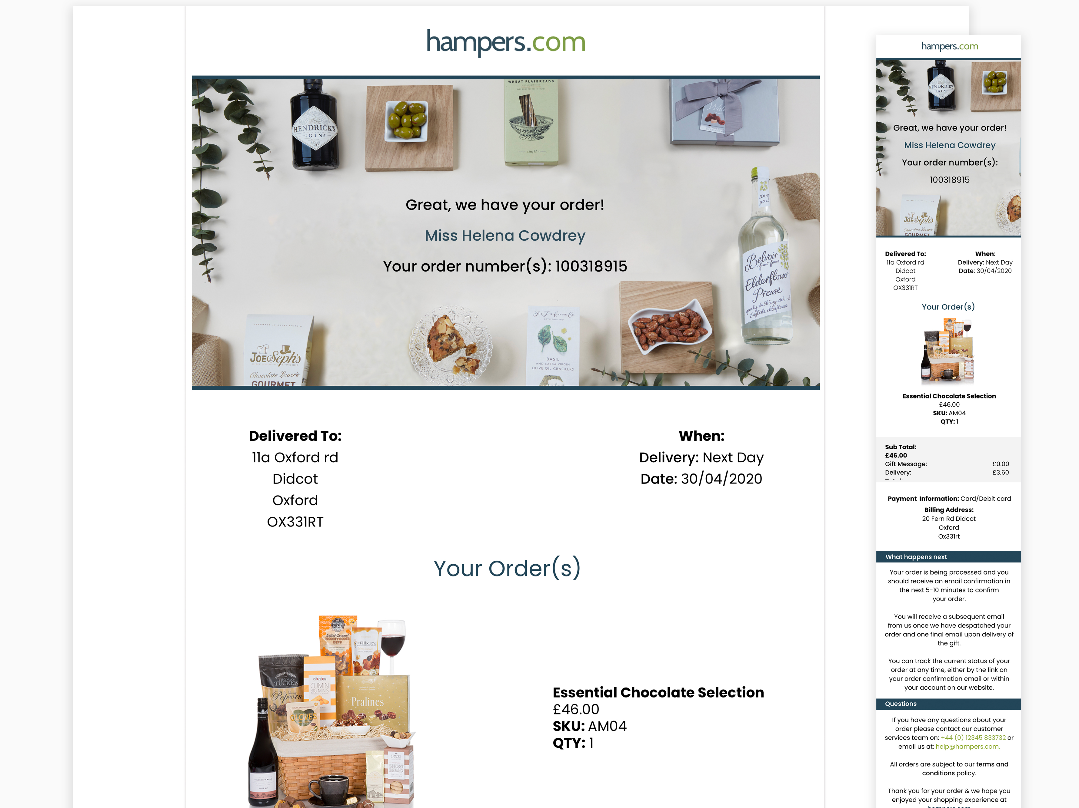 hampers.com Web Confirmation Purchase Page